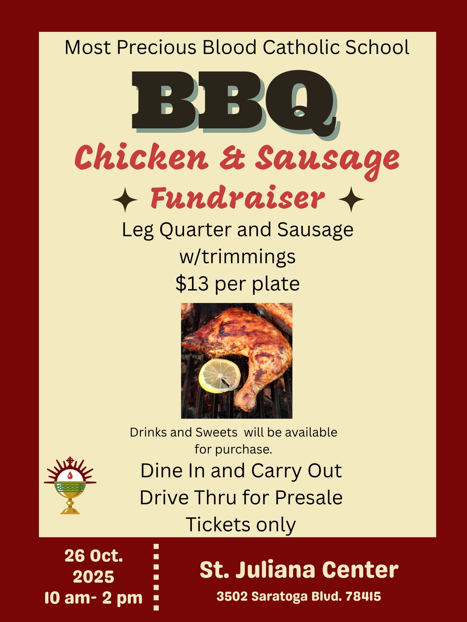 Support our school and enjoy a delicious BBQ plate loaded with juicy chicken, savory sausage, and all the fixings! All proceeds will benefit Most Precious Blood Catholic School. Come hungry and help a great cause!