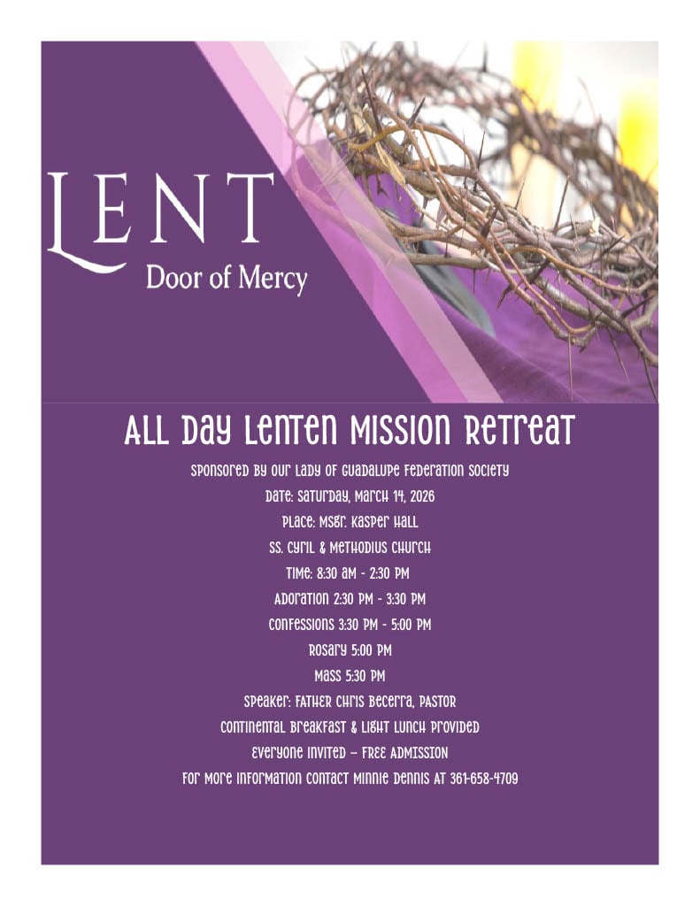 The Our Lady of Guadalupe Federation Society at Ss. Cyril and Methodius Catholic Church is sponsoring an all-day Lent retreat. In addition to Adoration, Confession, a rosary and Holy Mass, the retreat will feature Father Chris Becerra as guest speaker. Continental breakfast and lunch will be provided. This is a free event. We look forward to walking together on our Lenten journey!