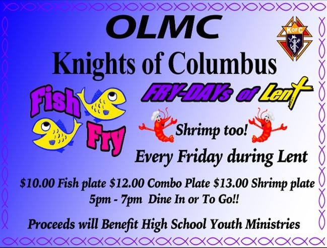 You are invited to the Our Lady of Mount Carmel Knights of Columbus fish fry every Friday during Lent from 5pm-7pm. Dine in or carry out. Choose from a $10 fish plate or a $12 combo plate (fish/shrimp). A $13 shrimp plate will also be available. Proceeds will benefit high school youth ministries.