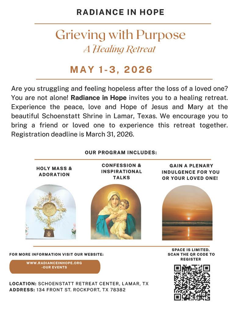 Are you struggling and feeling hopeless after the loss of a loved one? You are not alone! Radiance in Hope invites you to a healing retreat. Experience the peace, love and Hope of Jesus and Mary at the beautiful Schoenstatt Shrine in Lamar, Texas. We encourage you to bring a friend or loved one to experience this retreat together. Registration deadline is March 31, 2026.