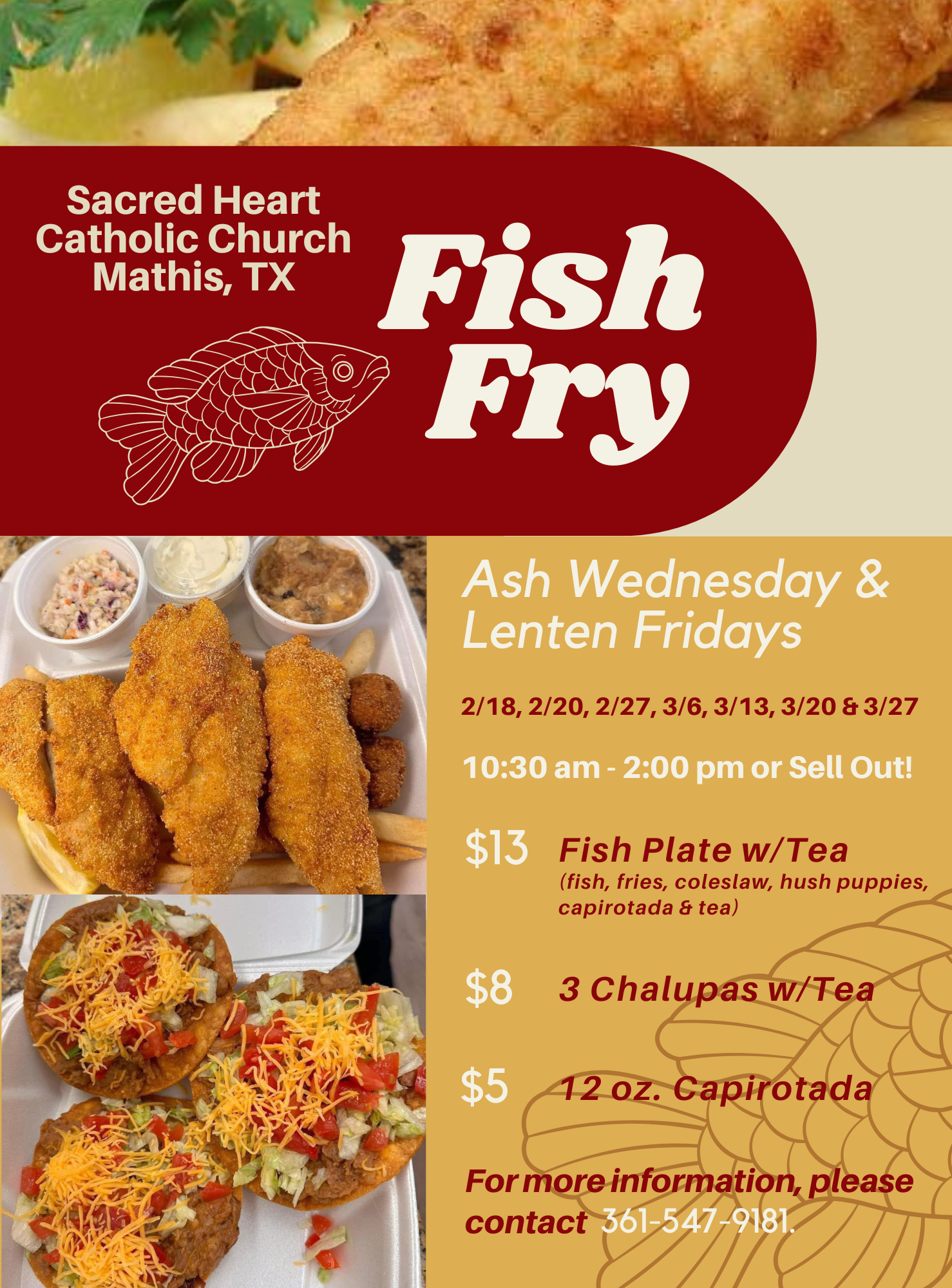 Come out and support Sacred Heart Parish in Mathis during their Lenten Fish Fries! The food is delicious and worth the drive. Dine-in, carryout, drive thru and local delivery available.
