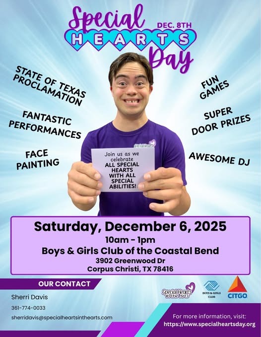Everyone is invited to be a part of Special Hearts Day on December 8th. There will be an official State of Texas Proclamation, great performances, face painting, a DJ playing your favorite music, games, and door prizes. It will take place at the Boys and Girls Club of the Coastal Bend. Find out more at specialheartsday.org.