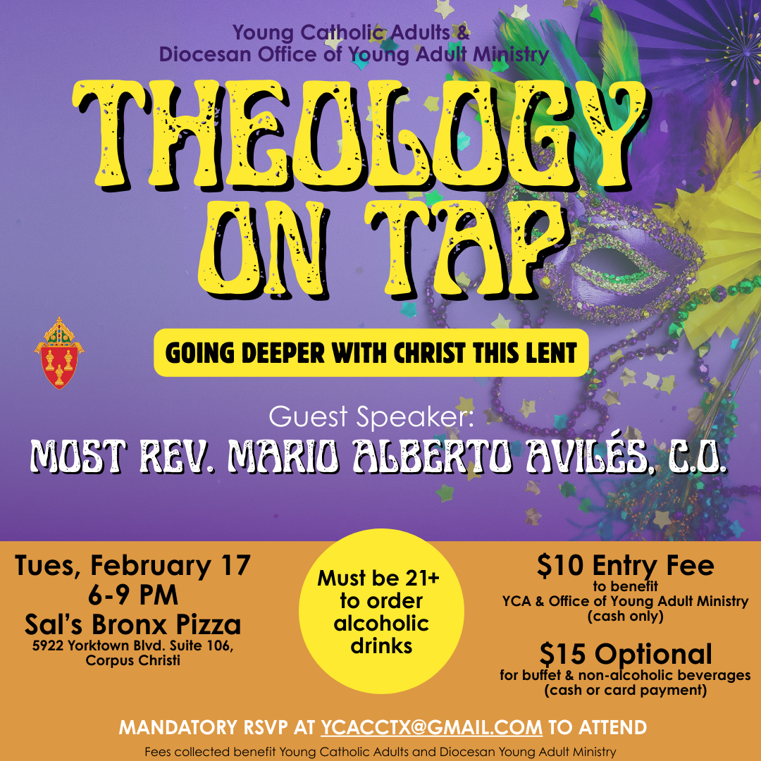 All young adults (18-39) are invited to Theology on Tap with Bishop Mario Avilés! Our topic: Going Deeper with Christ this Lent and Beyond. It will happen on Mardi Gras, Tuesday, February 17 from 6:00 p.m. to 9:00 p.m. at Sal’s Bronx Pizza, located at 5922 Yorktown Blvd.
